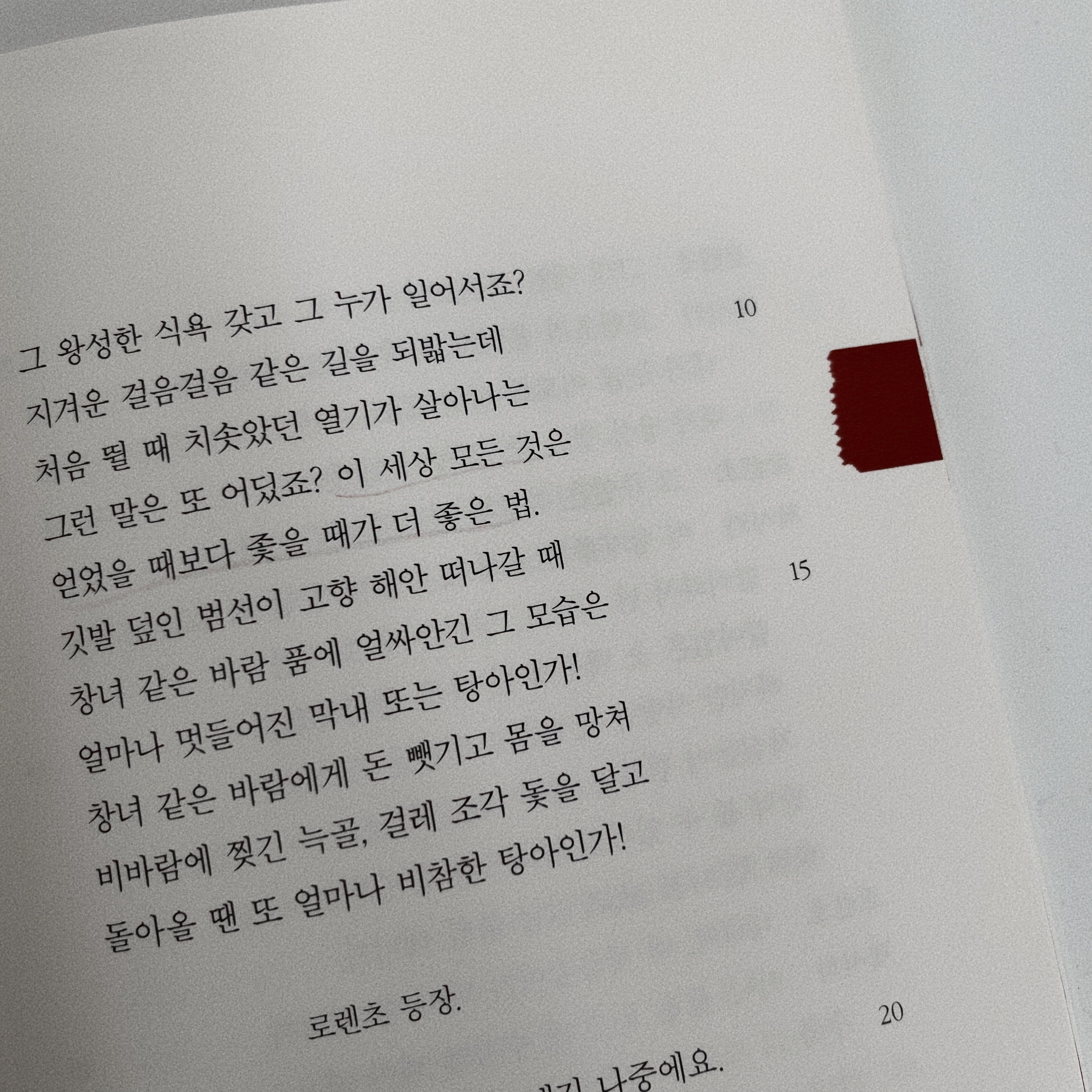 나는 고민 끝에 양극단에 선 무언가가 존재하지 않는 것처럼 완전한 중간도 없다는 결론에 다다른다. 그러니 내게 찾아온 감정의 가운데를 찾기보다는 그저 수용하는 것이 훨씬 현명한 일이 아닐까. 극 중 포샤는 자기에게 주어진 감정을 "일단 받아들인다. 그러나 집착하거나 머물지도 않는다."(143쪽) 모든 것이 흘러가는 대로 둔다. 순간의 행복을 만끽하되 집착하지 않고, 순간의 우울을 받아들이되 머무르지 않는다. 지나온 것을 추억하되 미련을 두지 않고 그저 다음 단계로 넘어설 준비를 한다. 내가 어릴 적부터 꿈꿔왔던 지혜는 분명 그런 생김새일 것이라는 생각이 든다. 이제야 흐릿하게나마 보이는 지혜를 조금이나마 흉내 내며 살아갈 수 있을까. 종이 사이 숨은 질문들의 무게가 삶을 짓누른다.
